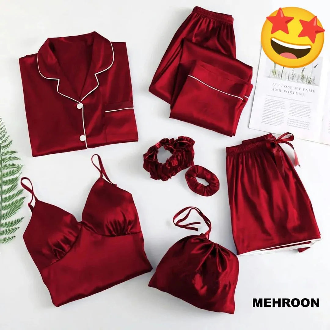 • Fabric: Silk• Pattern: Plain• Product Feature: Comes With Shorts• Available Sizes: Standard Size• Number Of Pieces: 5 Pcs• Package Includes: 1 x Sleep Shirt, 1 x Sleep Trouser, 1 x Shorts• Shirt Length: 30 Inches• Shirt Chest: 20 Inches• Shirt Shoulder: 18 Inches• Trouser Length: 37 Inches• Color: Maroon and Pink• Note: There might be an error of 1-3 cm due to manual measurement, and slight color differences may occur as a result of varying lighting and monitor effects.